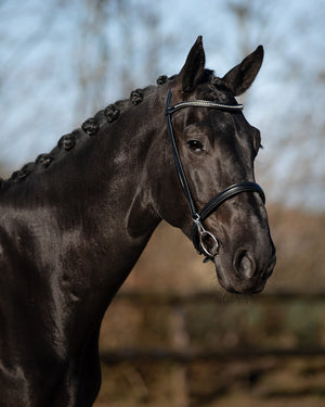 Leather show bridle with cool brow band. The noseband is softly padded and is adjustable on the headpiece. This bridle is used during the presentation of horses and during shows.