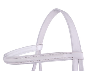 White show bridle made of leather. Perfect for presenting horses during an event. Equipped with silver coloured stainless steel parts.