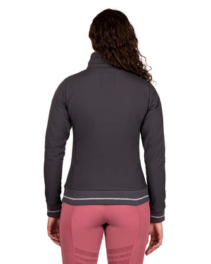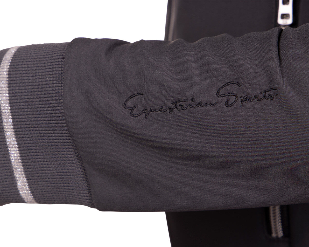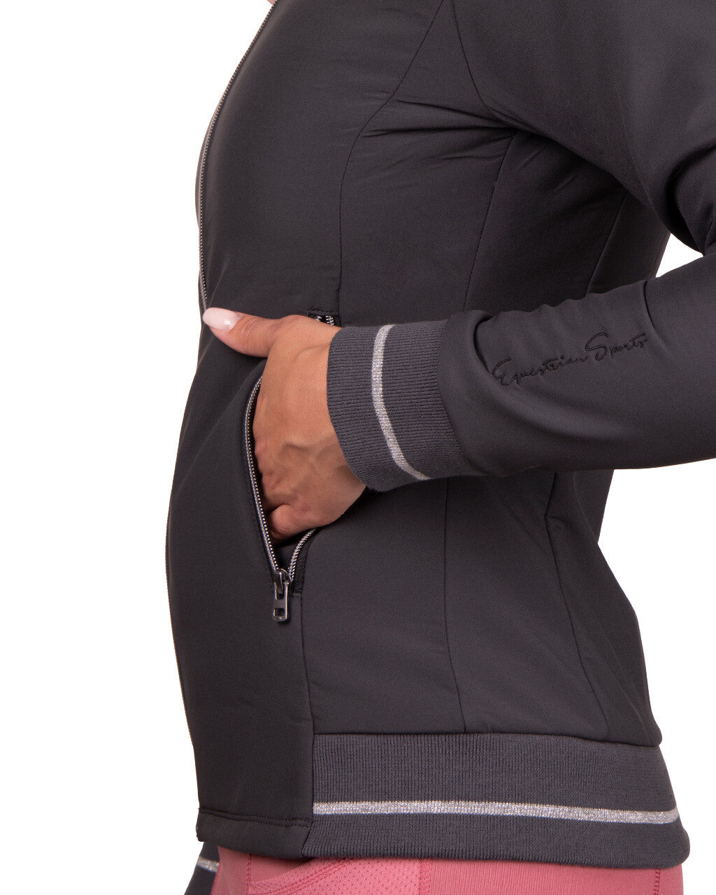 Tailored jacket of light softshell material with silver details. The inside of the jacket is made of fleece, which makes this jacket ideal for the cooler summer days. The hem and sleeves have an elastic band, making the jacket fit nicely. There is a silver stripe through the elastic which is matching to the silver coloured zippers and embroidery.