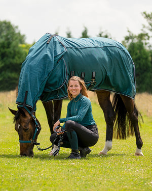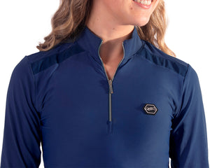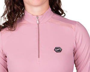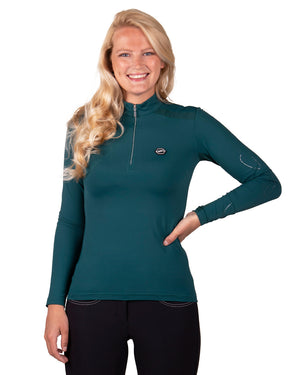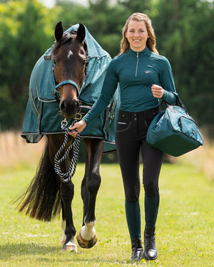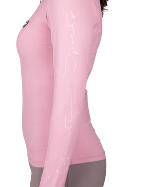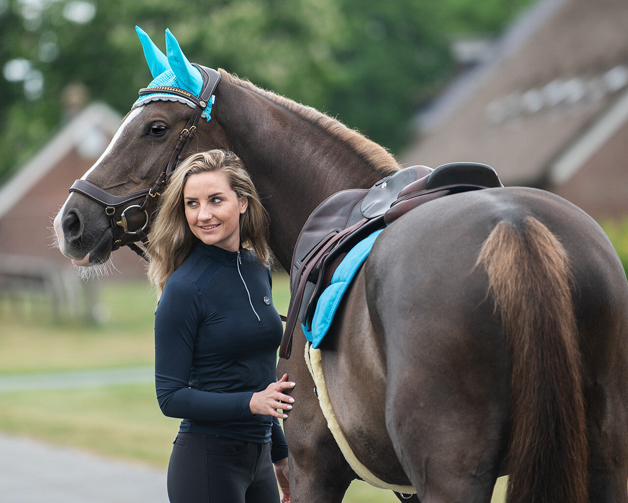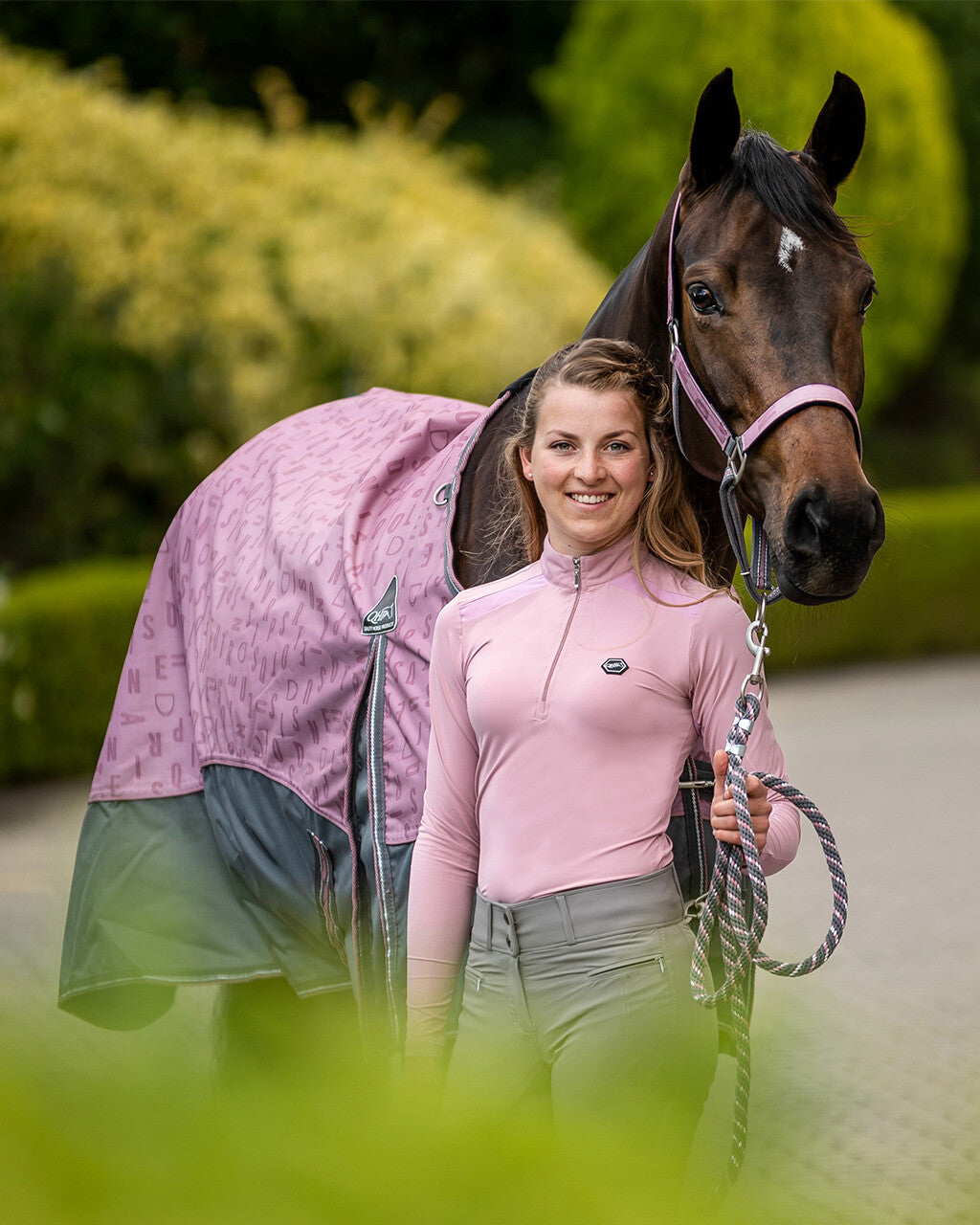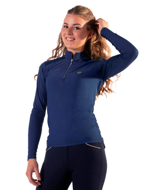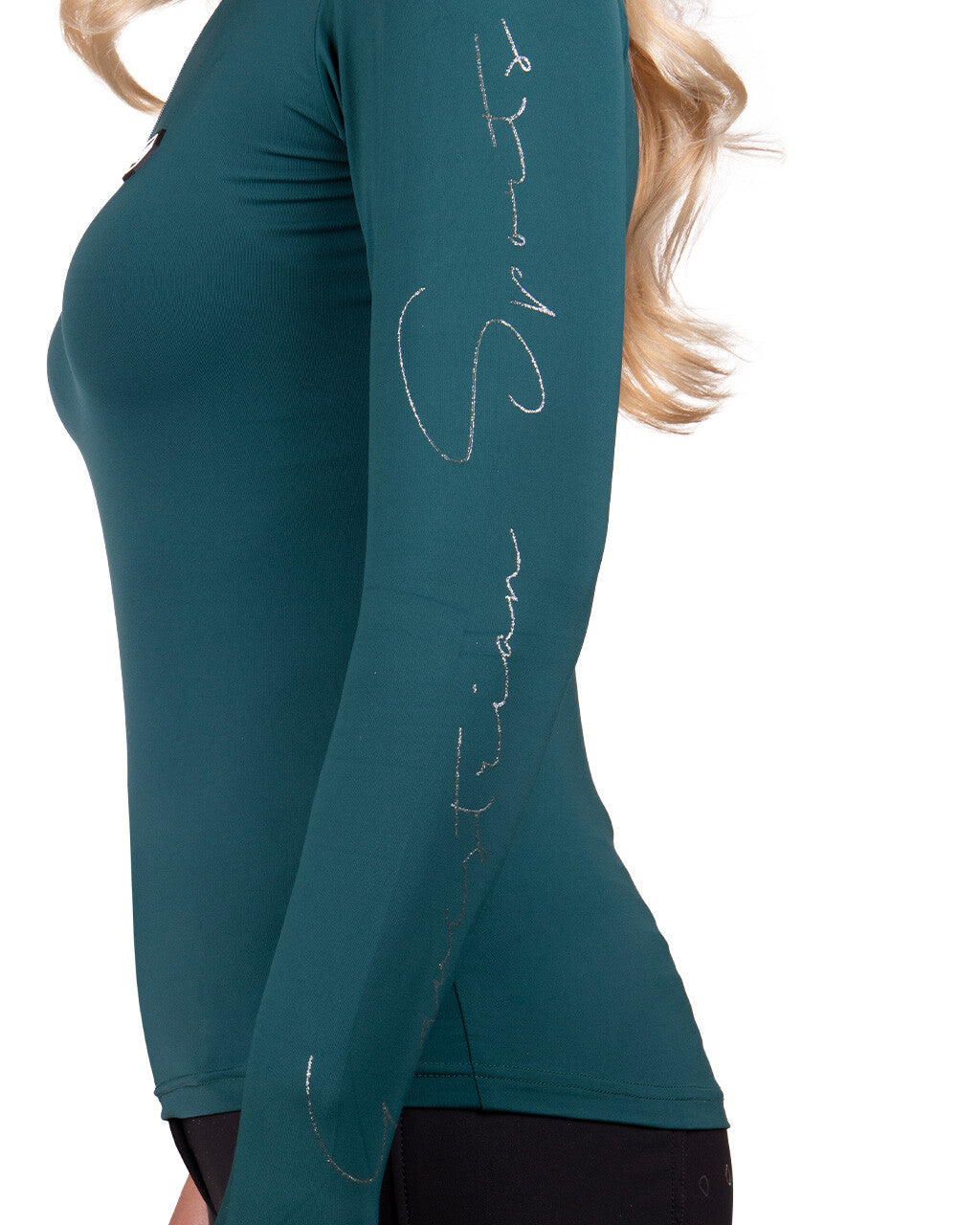 Sporty UV resistant shirt which is perfect for training because of the fast drying and breathable fabric. The underside of the sleeves have mesh inserts. Mesh inserts are also placed on the front of the shoulders. The shirt is finished with a large 'Equestrian Sports' glitter print along the left arm.