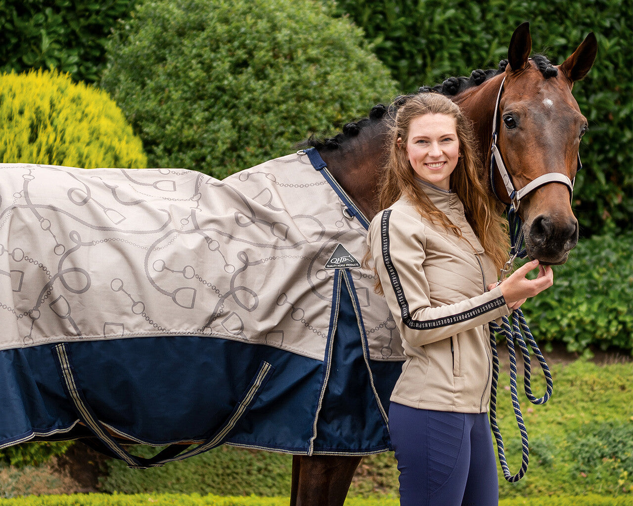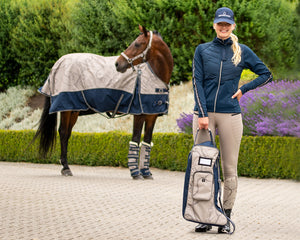 • At the top, the zipper has a flap with button closure, with the text "Equestrian Sports"