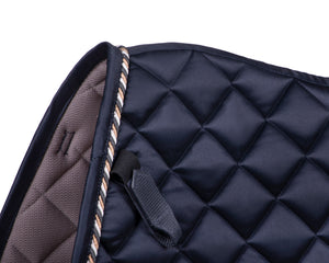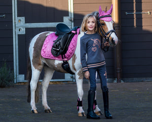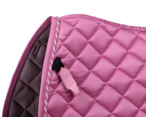 Cute saddle pad with super cute golden unicorn print on the back. The saddle pad is decorated with a two-tone decorative cord along the edge. Equipped with girth loops to ensure that the saddle pad stays in place.