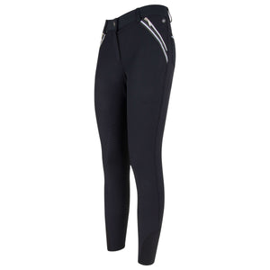 This breeches will be your Personal Choice! It is so superior and chique, but still have the sparkly IR touch by the lurex yarn in details The front pockets are zip pockets with the IR metal coin in the left corner. At the right backpocket you will find the sparkling sequin badge. The fabric is very soft and comfortable, is 4-way stretch, has high breathability and is water repellent.