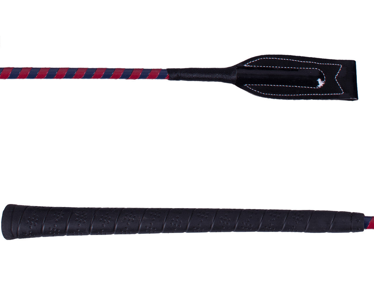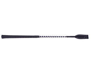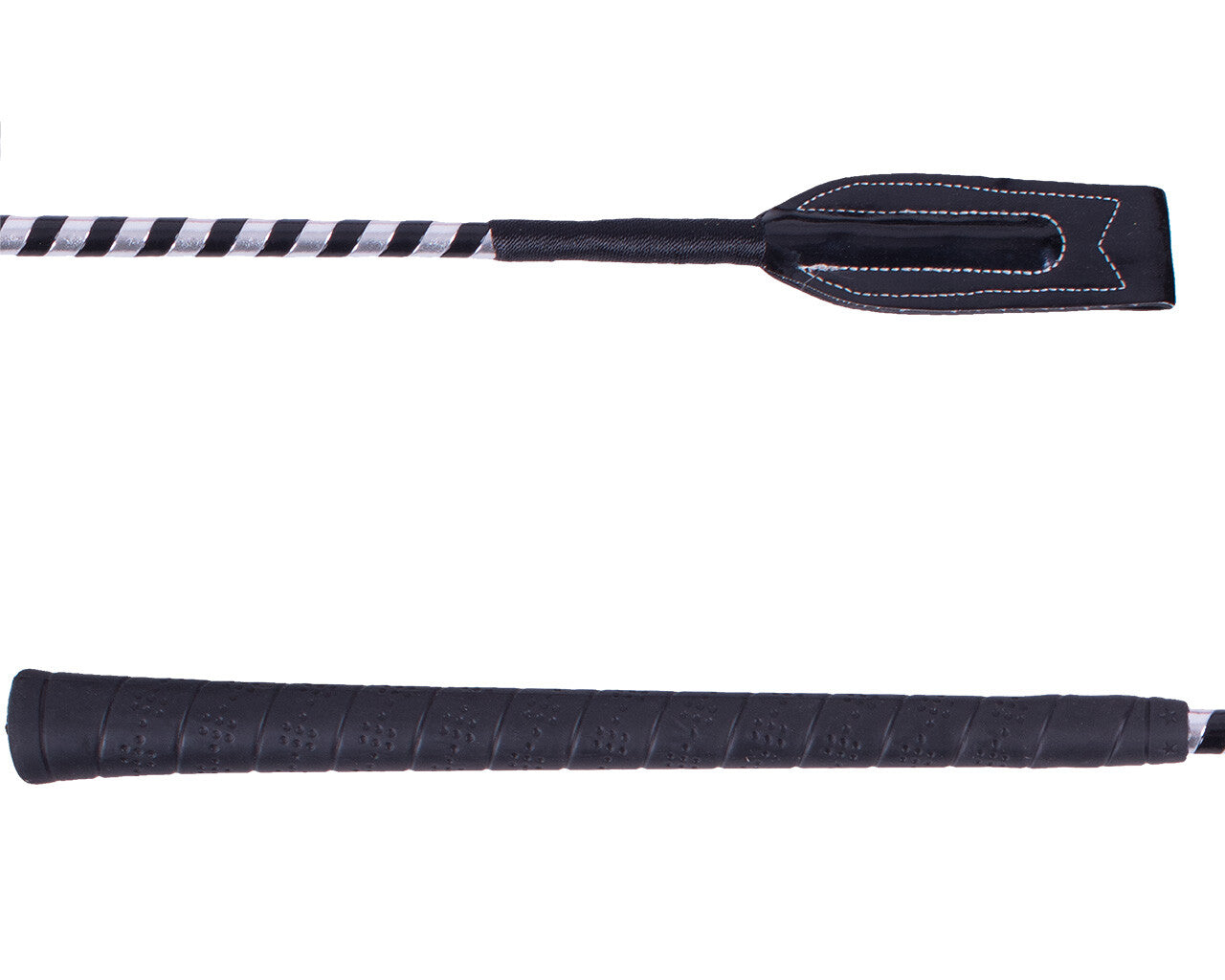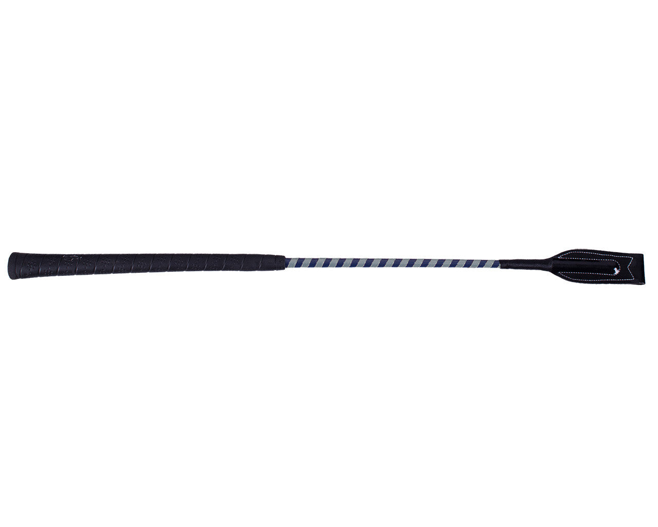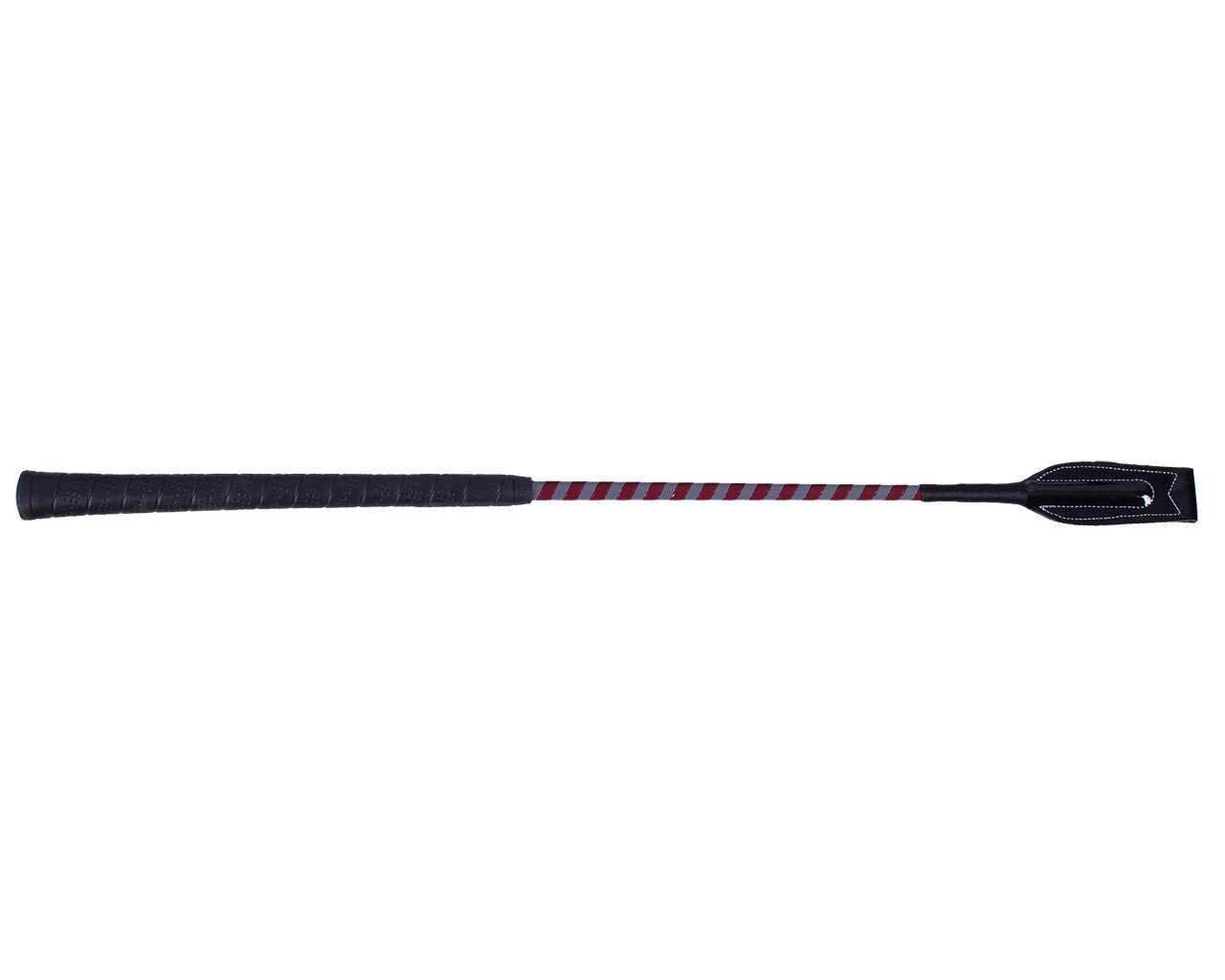 Jumping whip with rubber handle and artificial patent leather end. The whip is wrapped with two colours which match with the other Q-Cross products.