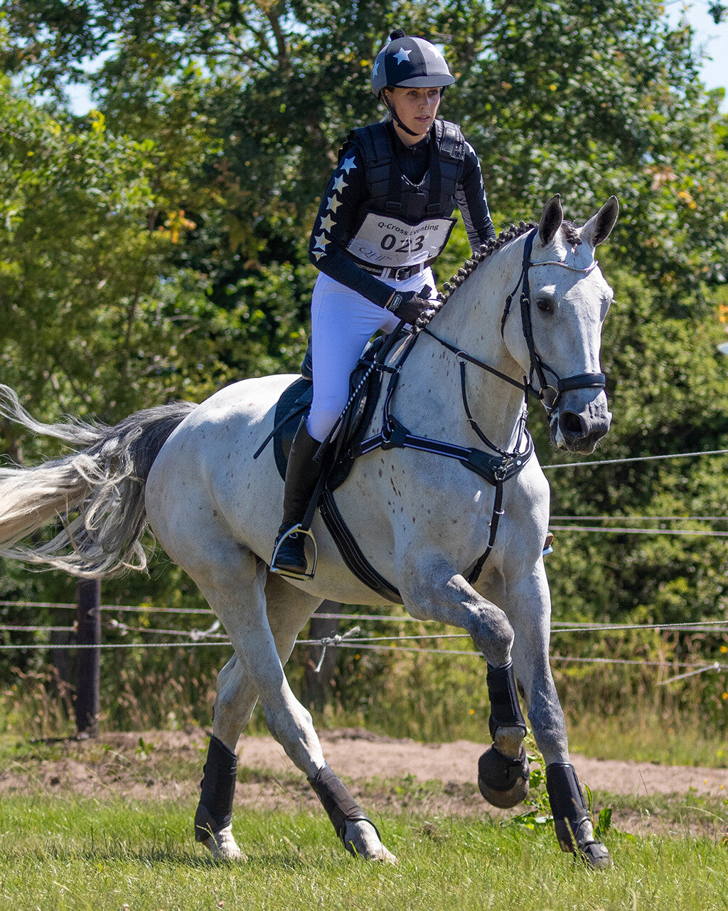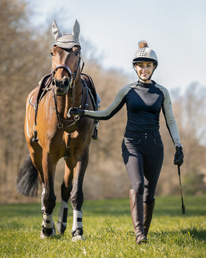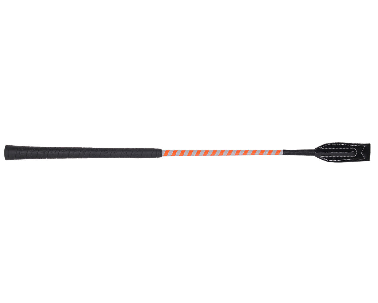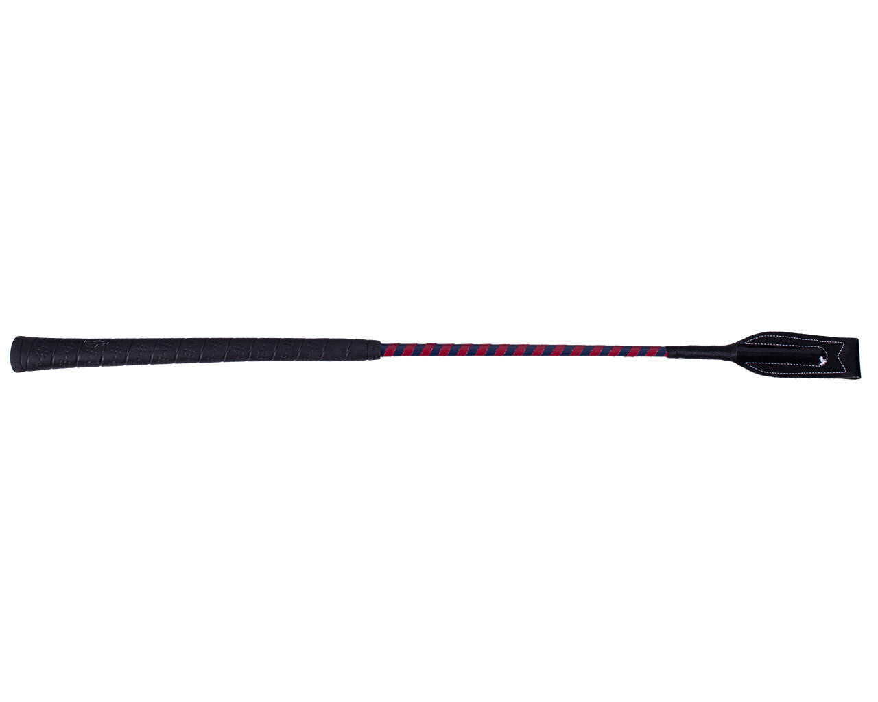 Jumping whip with rubber handle and artificial patent leather end. The whip is wrapped with two colours which match with the other Q-Cross products.