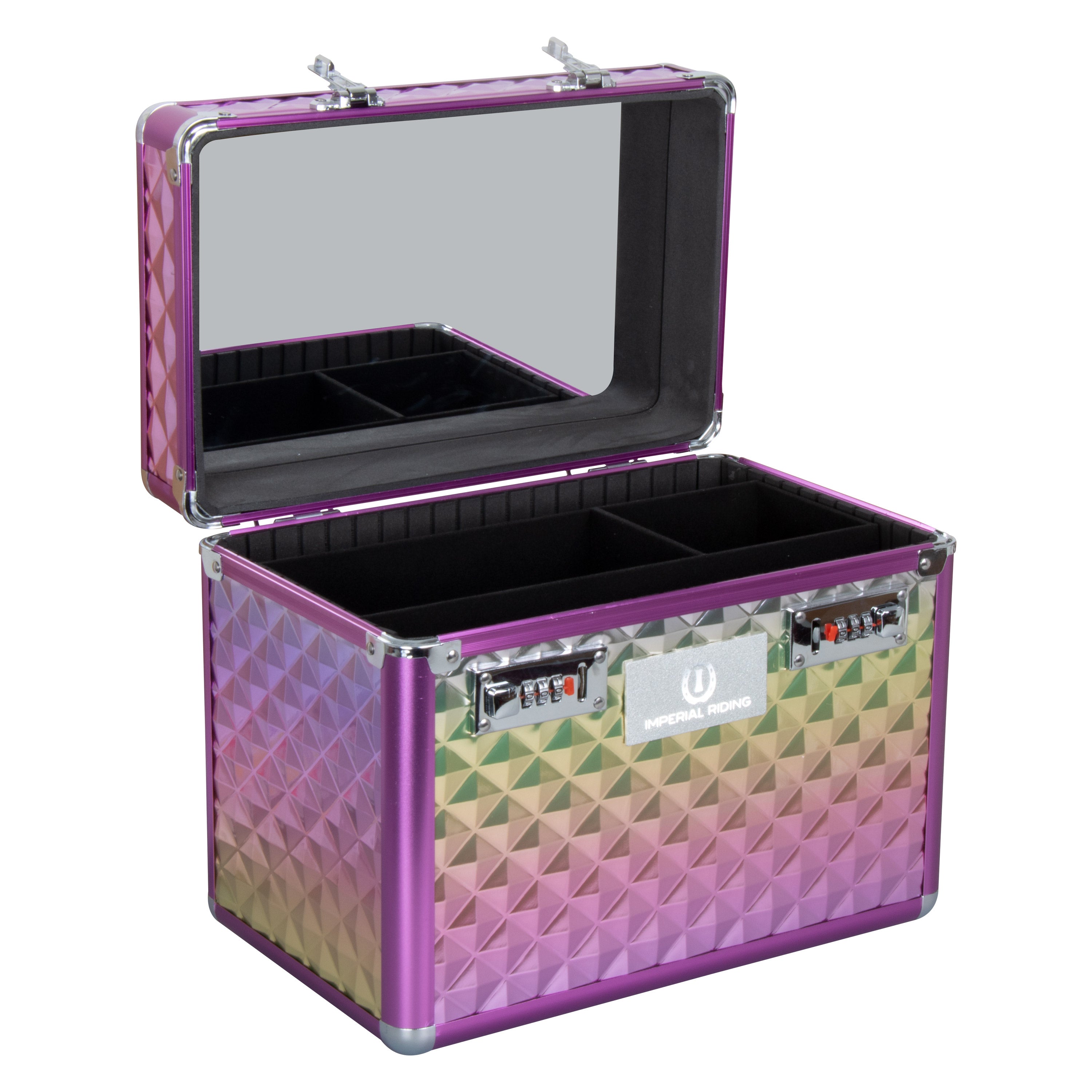 Our bestselling grooming box now also in small! Only the best for your horse and it’s care – our best seller Grooming Box Shiny is the perfect beauty case to store all of your grooming equipment and accessories. The inlay of this box is made of a soft material to protect your valuable items and the space dividers can be adjusted to organize your items nicely. A smaller tray holds smaller items such as treats and hair ties and a mirror in the lid lets you have a quick style check before leaving for your ride. To keep it all safe, the Shiny Grooming Box can be locked with two combination locks. This strong, durable and easy to clean grooming box will always be there to assists you during your daily training, competition and all your other adventures in the stables.