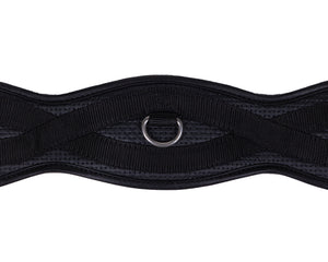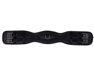 Fine black dressage girth made of strong material. Because the girth is anatomically shaped it provides more comfort and freedom of movement. The girth has a ring in the middle for attaching a training aid.