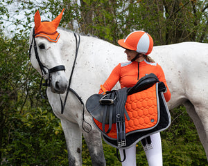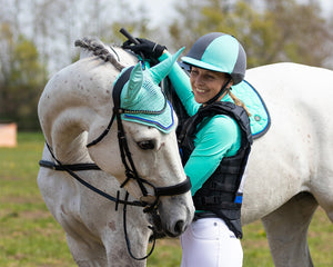 Helmet cover with visor that can be used with helmets with or without visor. Eventing helmets do not have a visor because this can be dangerous in case of a fall. The visor of the cover cover does not obstruct during a fall and is not dangerous. The cover matches with the products of the Q-Cross collection, so it completes the outfit.