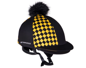 Cool cap cover with fluffy pompon, flap and plaid print. On the side is the text: 'Keep calm & focus'. The helmet cover can be used with helmet with or without visor. Eventings helmet do not have a visor because this can be dangerous in case of a fall. The visor of the helmet cover does not obstruct during a fall and does not constitute a risk to the rider.