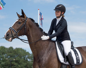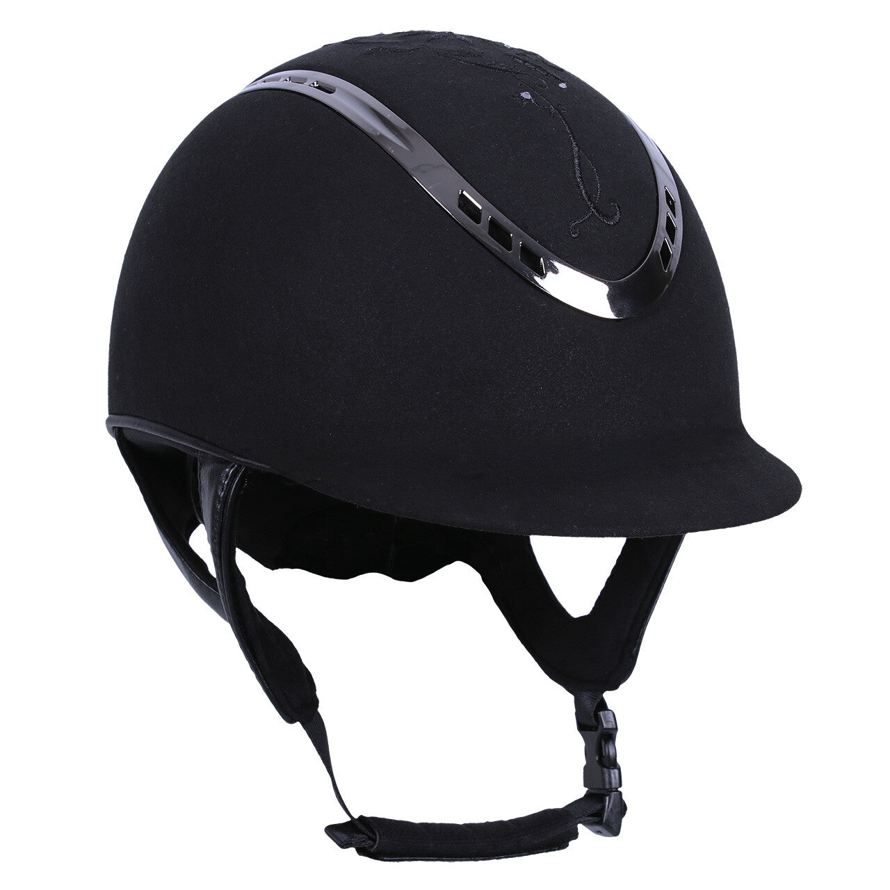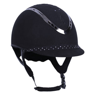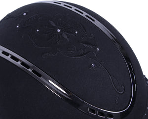 Safety helmet with suedine on the outside and a chic embroidery with rhinestones on top. The look of the helmet can easily be changed by the detachable strap with rhinestones on the front. The black vent on top finishes the chic look.