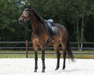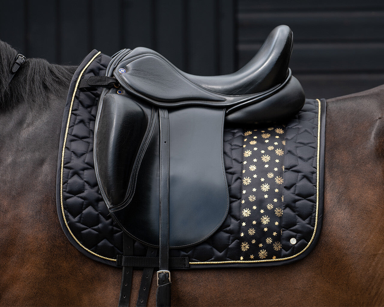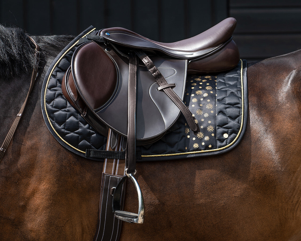 Sparkle up your ride! With saddle pad Celebrate you will make a party of the days around the New Year. The black satin saddle pad is provided with golden details and...