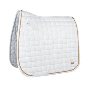 Luxurious dressage saddle pad with anatomical fit. The saddle pad features a Quick Dry inner lining for optimal comfort.Product Specifications:- With cord and metal badge finish in silver or rose gold...