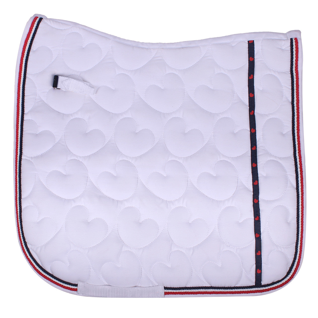 Let your Friesian shine with this Q-Friesian saddle pad! The contrasting stripe with Friesian leaf shapes and the stitched pattern in the shape of these leaves give the saddle pad a luxurious look. The red, white and blue decorative cord complete the look.