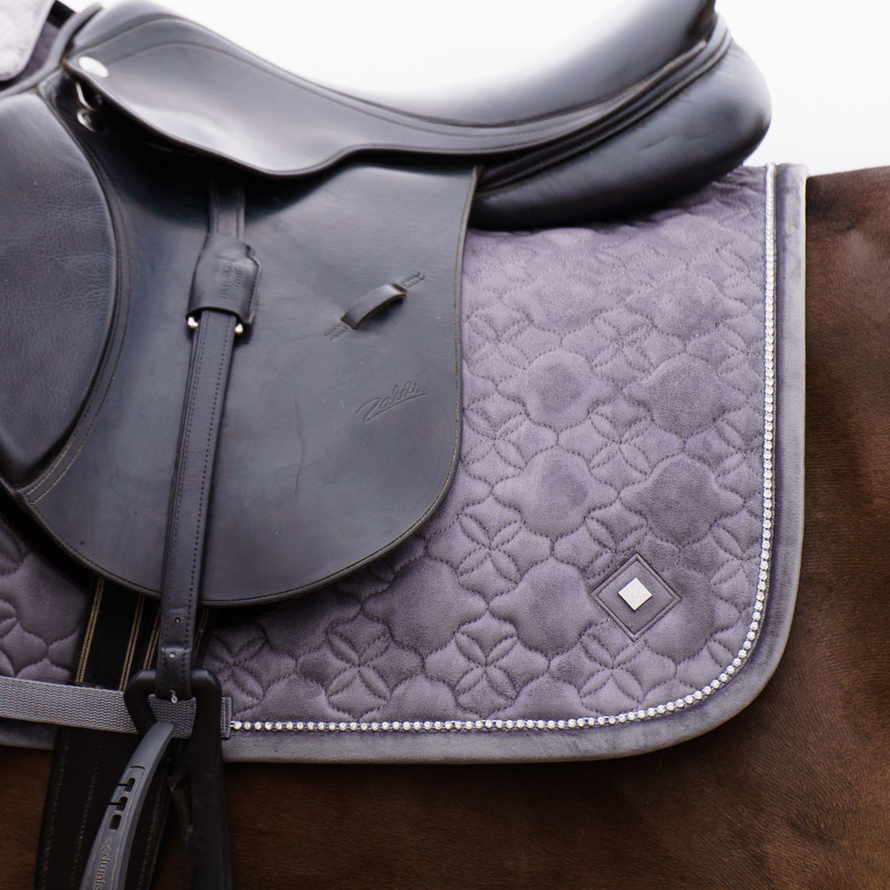 All saddlepads with tonal fur * Fur can be taken off * Rhinestone edge * Suede outer fabric * Velvet binding * Cotton poly lining