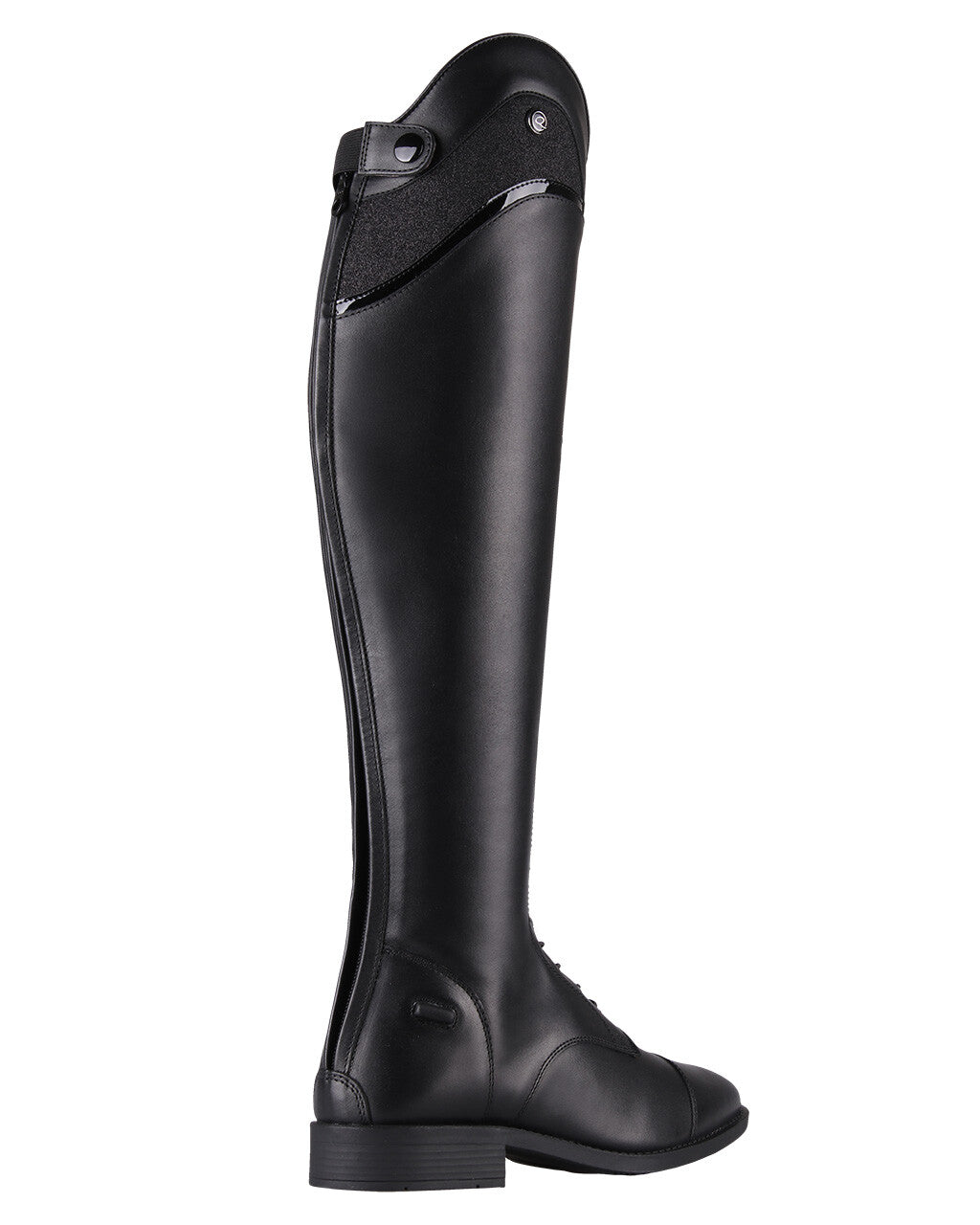Riding boot Hailey is a real eye-catcher in the ring. The top of the boot is decorated with patent leather and glitter. The decorative lacing provides a striking look, but the zip makes it easy to put on. The elasticated lace, elastic insert and comfortable insole ensure high wearing comfort.