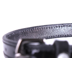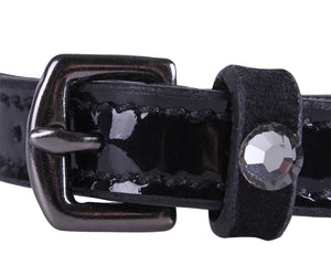 Black patent leather spur straps with silver coloured stainless steel buckle. Finished with suedine slider with grey rhinestone.