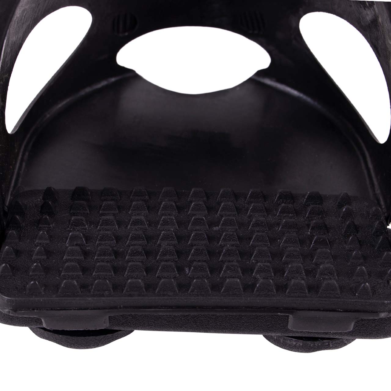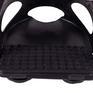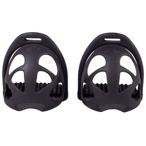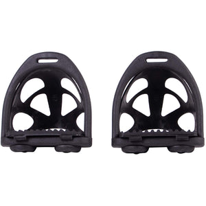 Black set of a stirrup and a detachable foot stopper. With the foot stopper you prevent your foot from sliding through the stirrup. If you don't need the foot stopper anymore you can simply remove it. You can then use the stirrup without the foot stopper.