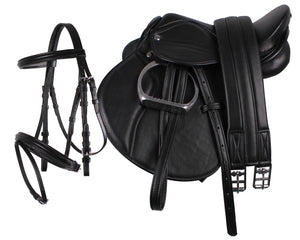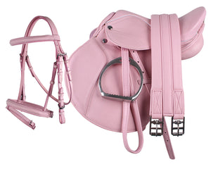This saddle set ensures the young rider is ready-to-go with his or her pony. The lightweight saddle comes with girth, stirrup leathers and stirrups. Also included is a bridle with noseband and flash.