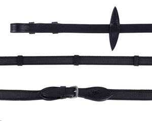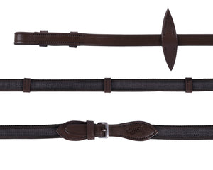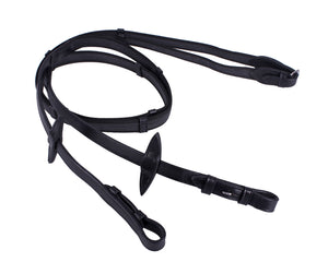 These reins have an interwoven rubber pattern across the length, ensuring a good hold of the reins. Finished with leather and equipped with martingale stoppers.