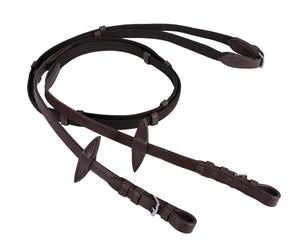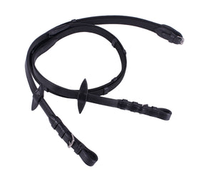 High quality basic web reins. Web reins provide more grip than traditional leather reins. Comes with leather martingale stops.