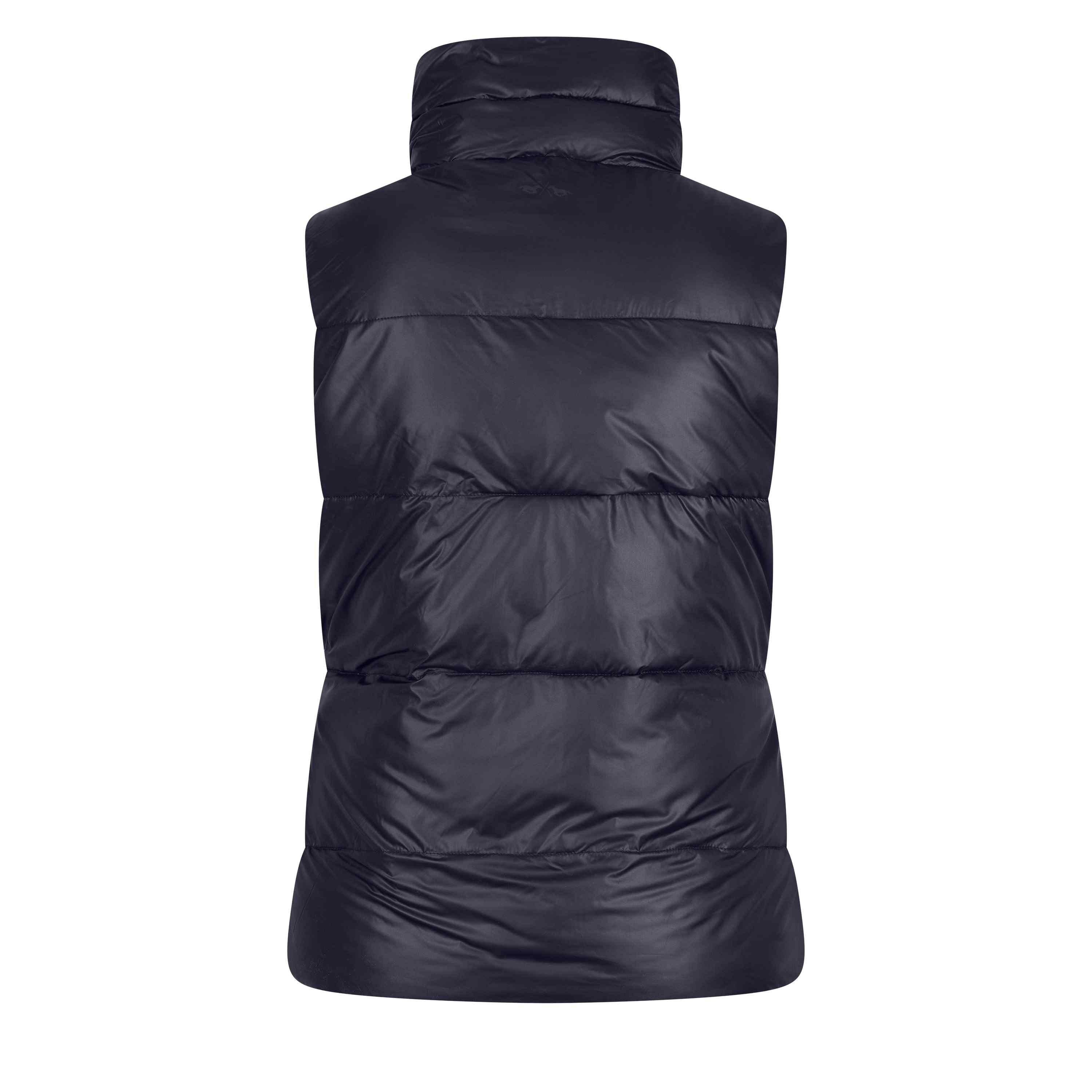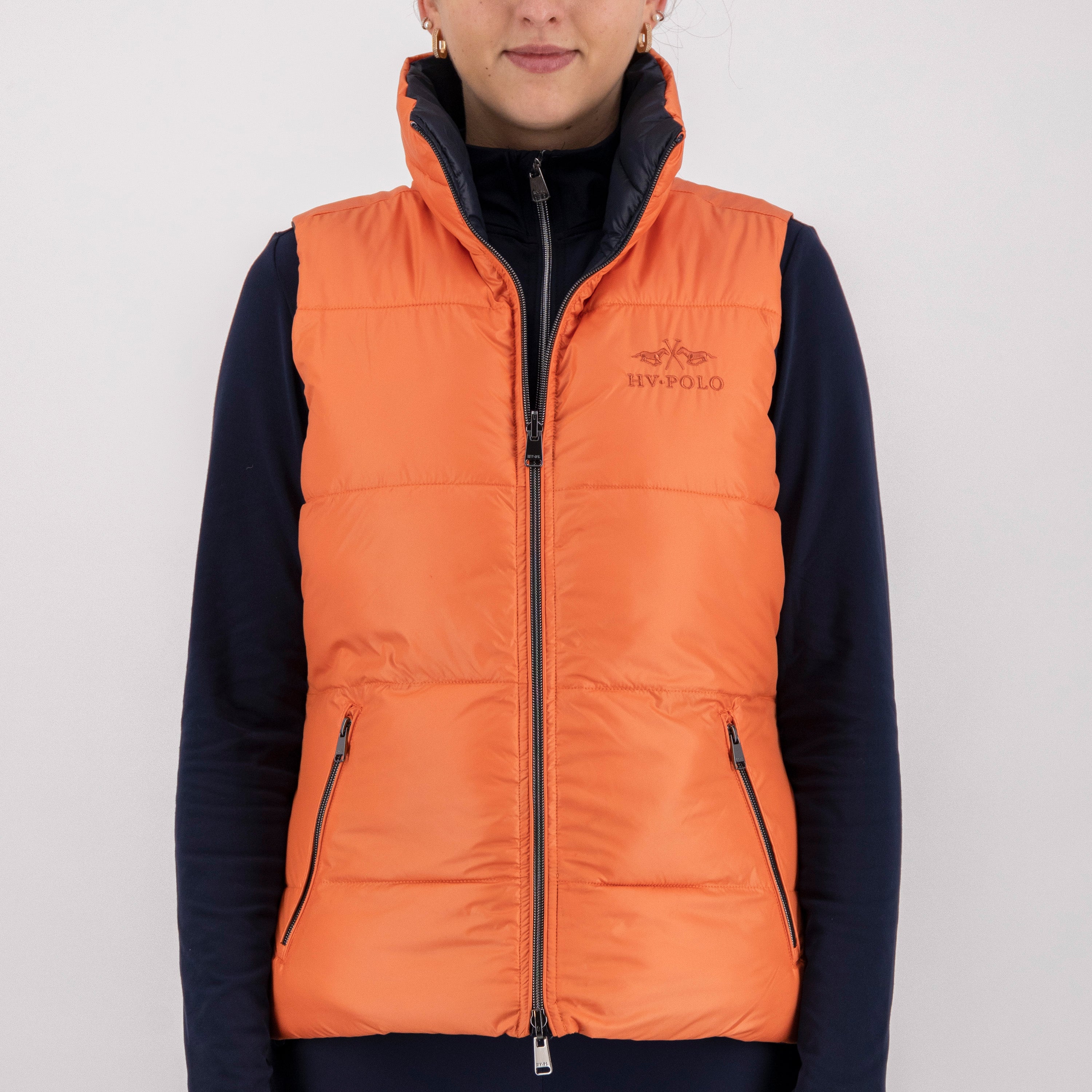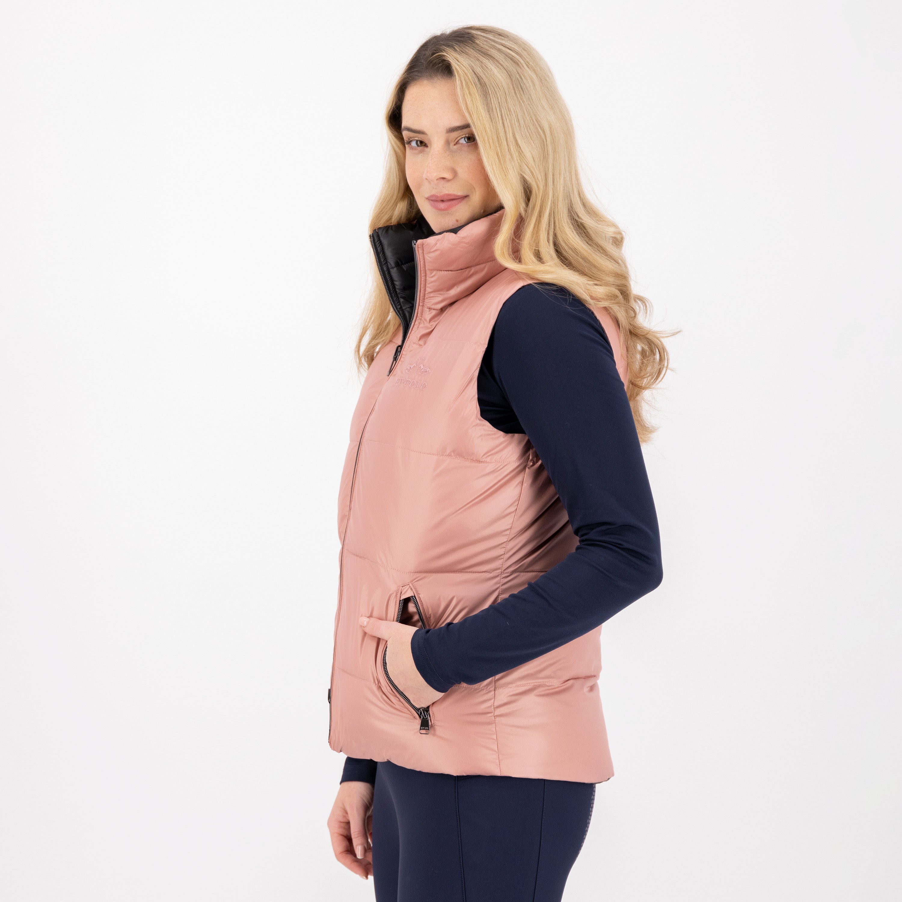 Stay warm and stylish with our new Reversible Bodywarmer. This medium padded bodywarmer comes in two matching colors combined to give you versatility in your wardrobe. The high collar and windproof design will keep you protected from the elements, while the breathable fabric ensures you stay comfortable all day long. nnThe 2-way zipper closure at the front with branded pullers adds a touch of luxury, and the HVPolo logo tonally embroidered on the chest gives you that classic equestrian look. On the other side, you'll find HVPolo horses printed in shiny metallic below the back neck for a subtle yet eye-catching detail. nnConvenient front pockets with zippers on one side and branded press buttons on the other side give you plenty of space to store your essentials. Black metallic accessories add a touch of sophistication to this must-have winter piece. Don't sacrifice style for warmth - get your reversible bodywarmer today!