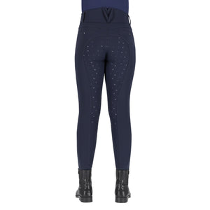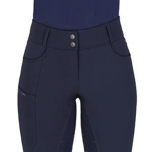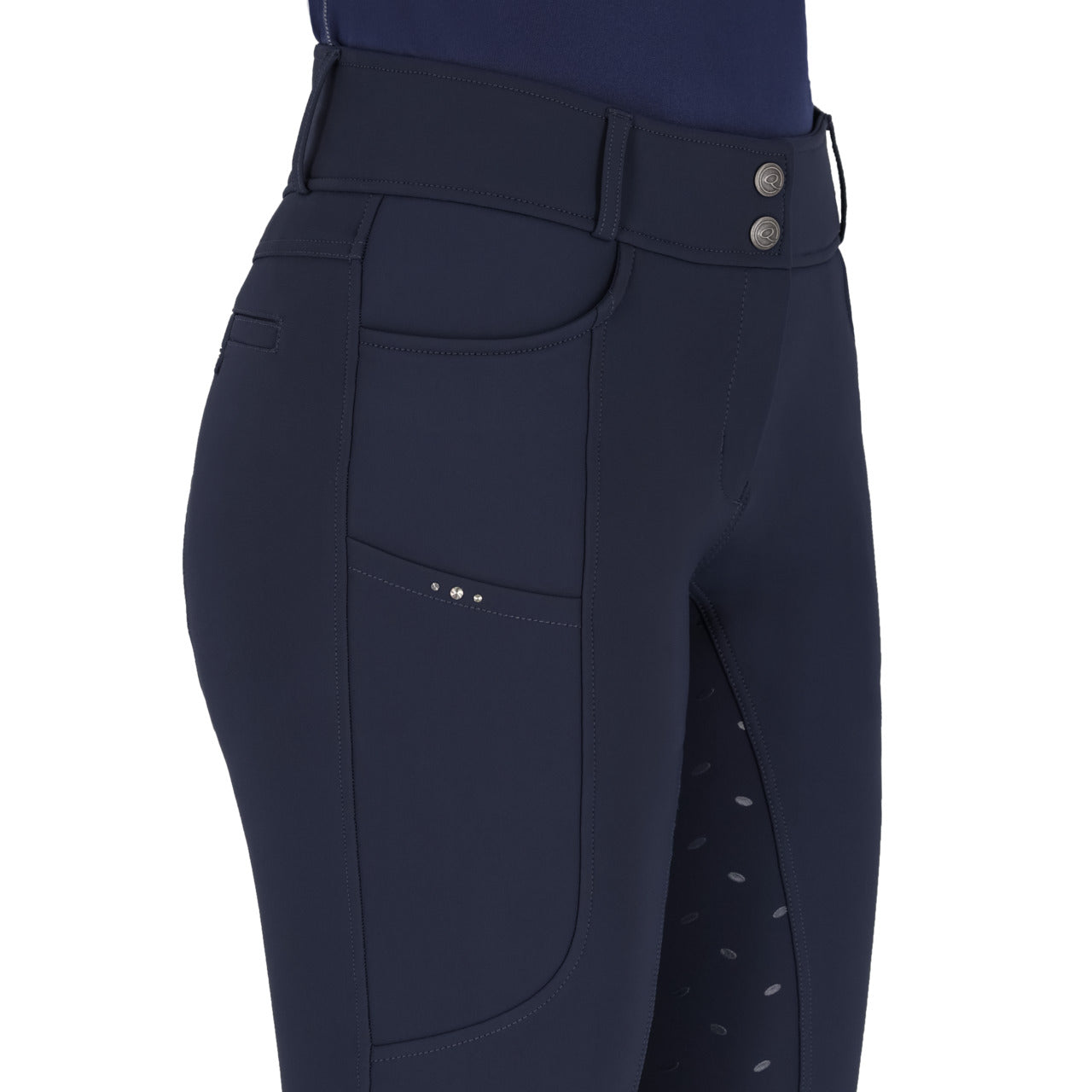 The Lymee riding breeches are made from softshell fabric and feature full seat with medium grip. The brushed interior provides a soft and warm feel, offering good insulation. These water-repellent breeches have two front pockets and an additional pocket with three stones on the right leg for your phone. Furthermore, the breeches are equipped with a Q-pin and elastane flex legs for added comfort.