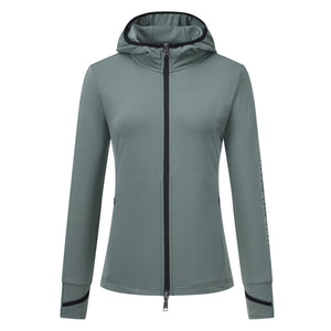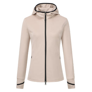 Presenting the latest addition to our equestrian sportswear collection: the Female Tech Shell Jacket. Designed with a medium length and a regular fit, this jacket is perfect for the modern rider who values both style and functionality. nnMade with 4-way stretch fabric, our jacket allows for effortless movement while riding. The quick dry technology ensures you stay dry and comfortable, no matter the weather conditions. The hood features a sleek satin binding at the edge, adding a touch of elegance to the design.nnSleeve strokes with metallic print proudly display our 'HV Polo Equestrian Sportwear' logo, while the cuffs come with a special thumbhole opening for added convenience. The HV Polo logo is subtly printed on the front hood and the Horses Logo serves as the main label inside below the neck.nnWith a 2-way zipper closure in black for all colorways and logo pullers, this jacket is as stylish as it is functional. The 2 blind zipped front pockets provide additional storage for your essentials. Elevate your riding experience with the Female Tech Shell Jacket from HV Polo.