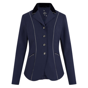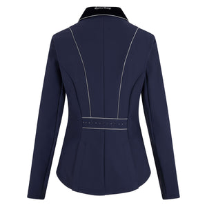 Chic tournament jacket with a beautiful fit and a glamorous touch. This stylish jacket with 4 shiny logo buttons features glittering, sparkling rhinestones on the zipped pockets at the front and on the rear straps in the back area. The shiny silver piping can be found all over this garment: on the front, on the zipped front pockets, along the edge of the collar, on the back, and along the rear strap. The collar is lined with fashionable velvet, and it features a shiny drawing on the back. This tailored jacket is lined with a net fabric that features a star pattern and has a high level of breathability. The front and the back are rounded and feature a double slot.