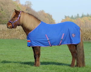 Luxury fleece rug in the colours of the Icelandic flag. The rug features double front closures with surcingle clasps. These closures are overlapped by a chest flap with Icelandic flag design. The trim and surcingle have a striped design. The rug is decorated with a rubber shield with the Icelandic flag and features a fleece patch on the withers.