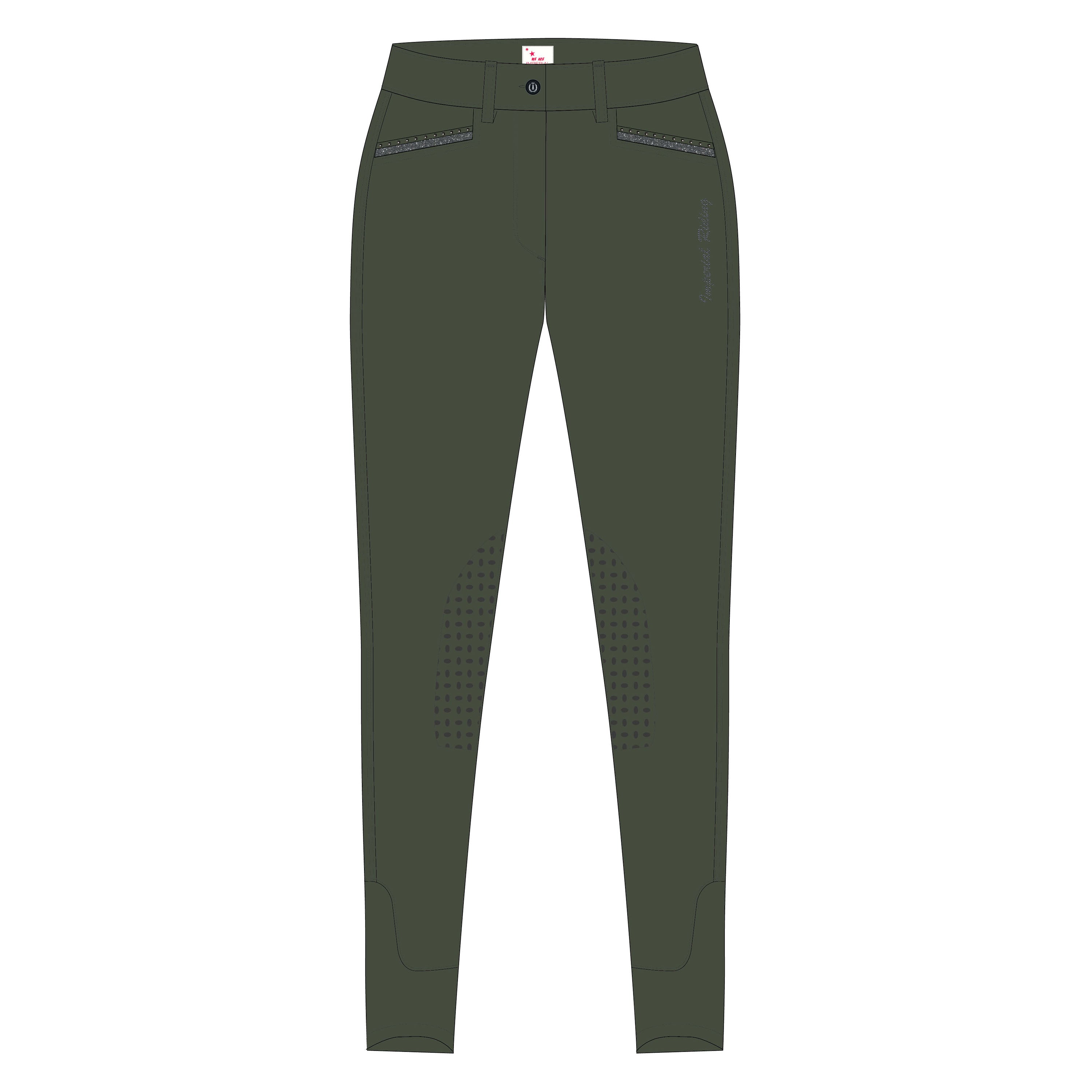Chic, feminine breeches with beautiful glitter accents. The classic four-pocket style of the El Capone breeches offers the perfect comfort whilst riding and are a true eye catcher. The rhinestones and glitter applications embellish the front and back pockets, belt loops and our Imperial Riding logo. The leg ends are elastic and made with color-matching textile. Not only do these breeches have a great stretch, but are also water- and dirt-repellent. Available in Full-Grip Silicone, Full-Seat with vegan leather & Knee-Grip Silicone.
