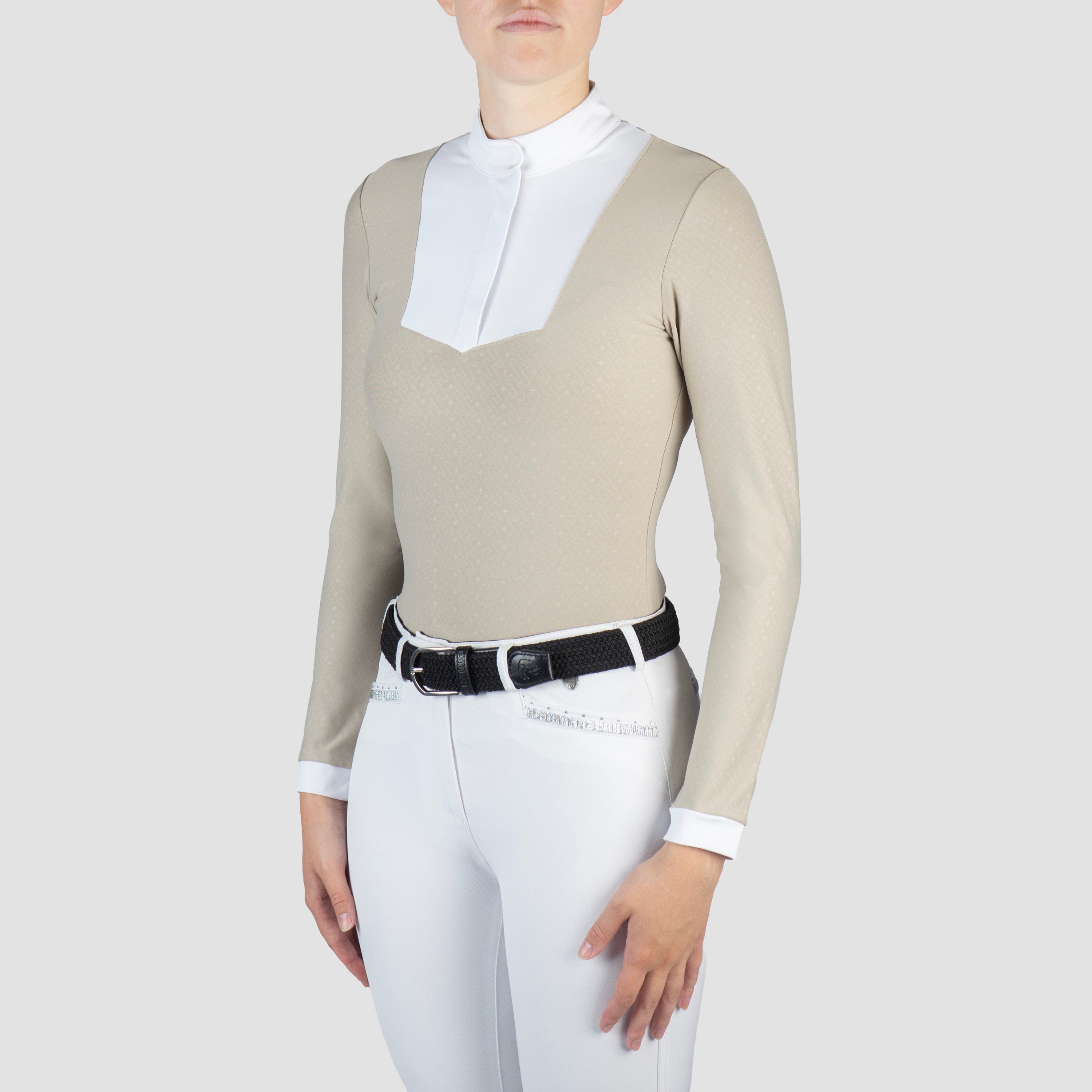 | Stylish long-sleeved show shirt with white collar, blind front zipper and all-over print. Product Specifications: - Show shirt with white collar - All-over print - Blind front zipper and small stand up collar Material: 73% polyester, 27% spandex Please note: this shirt runs small. When in doubt, size up. |