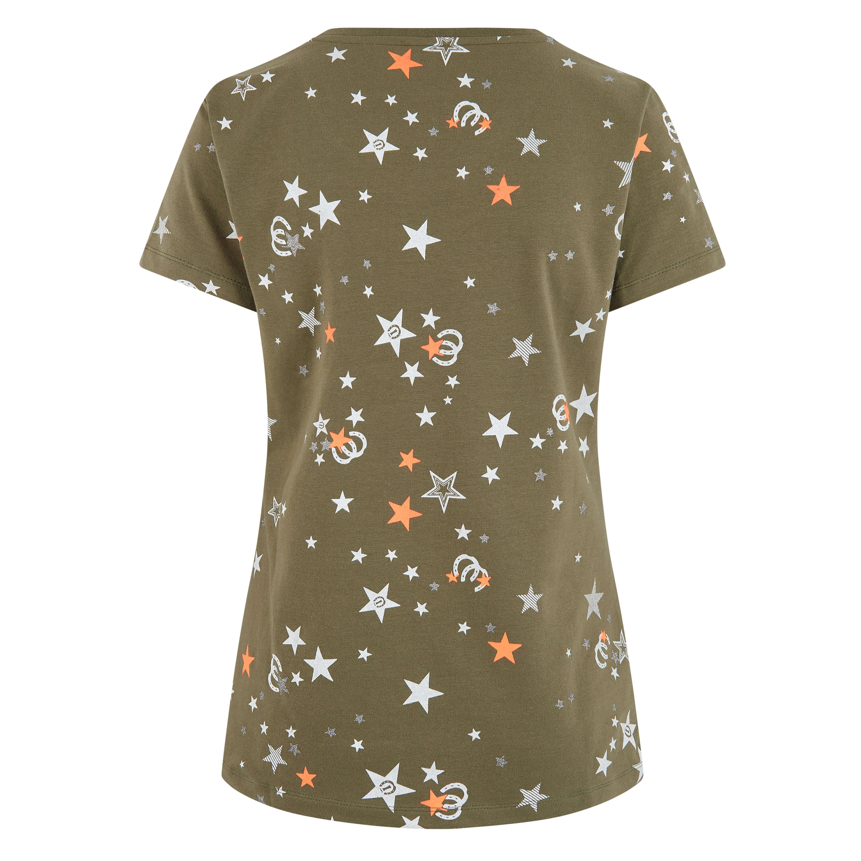 Eye-catching short-sleeved V-neck shirt. This shirt features an all-round pattern with a print mix of stars and the two famous horseshoes. The motifs come in different colours, patterns, and prints. And glitter is a must too, of course. This can be found in the silver stars and the glittering stripe on the inside of the neck. The V-neck features a finely-ribbed border to give its wearer additional comfort. The chest area of this fitted shirt features a trendy foam print with 3D effect into which the logo, the brand, and the text “Ride on” are integrated. Available in two stunningly beautiful colours. Let’s Ride!