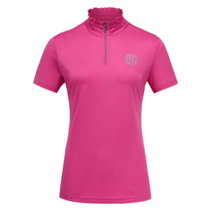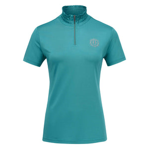 Half zip top * Standing collar with smock * Short sleeves * Rhinestones artwork at chest wearers left * Branded puller