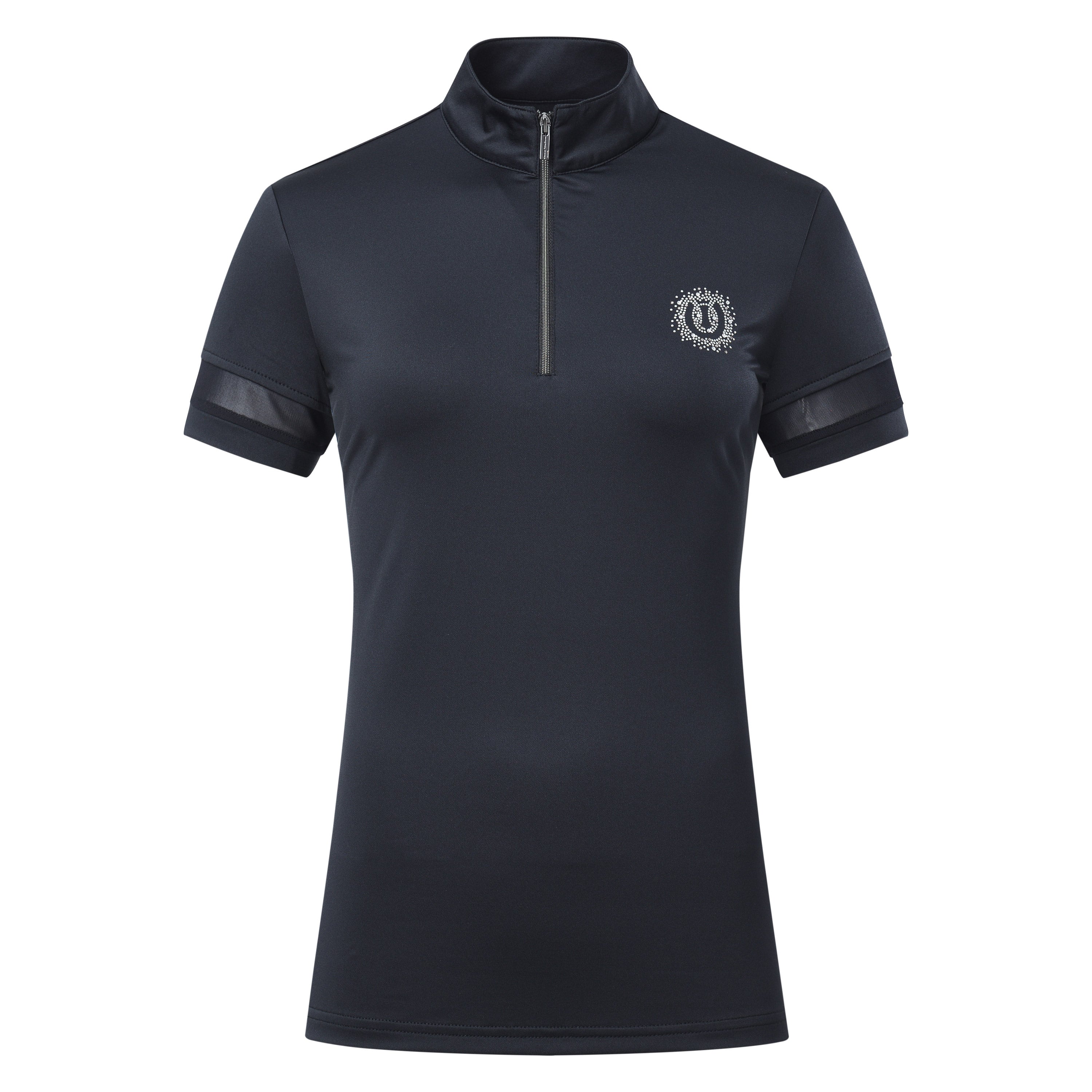 Half zip top * Standing collar * Short sleeves with mesh inserts * Rhinestones artwork at chest wearers left * Branded puller