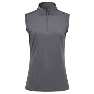 Half zip top * Shiny satin panels * Sleeveless * Transfer logo print artwork at chest wearers left * Shiny elastic lace tape in shoulder * Metal branding horse shoe coin at bottom