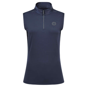 Half zip top * Shiny satin panels * Sleeveless * Transfer logo print artwork at chest wearers left * Shiny elastic lace tape in shoulder * Metal branding horse shoe coin...